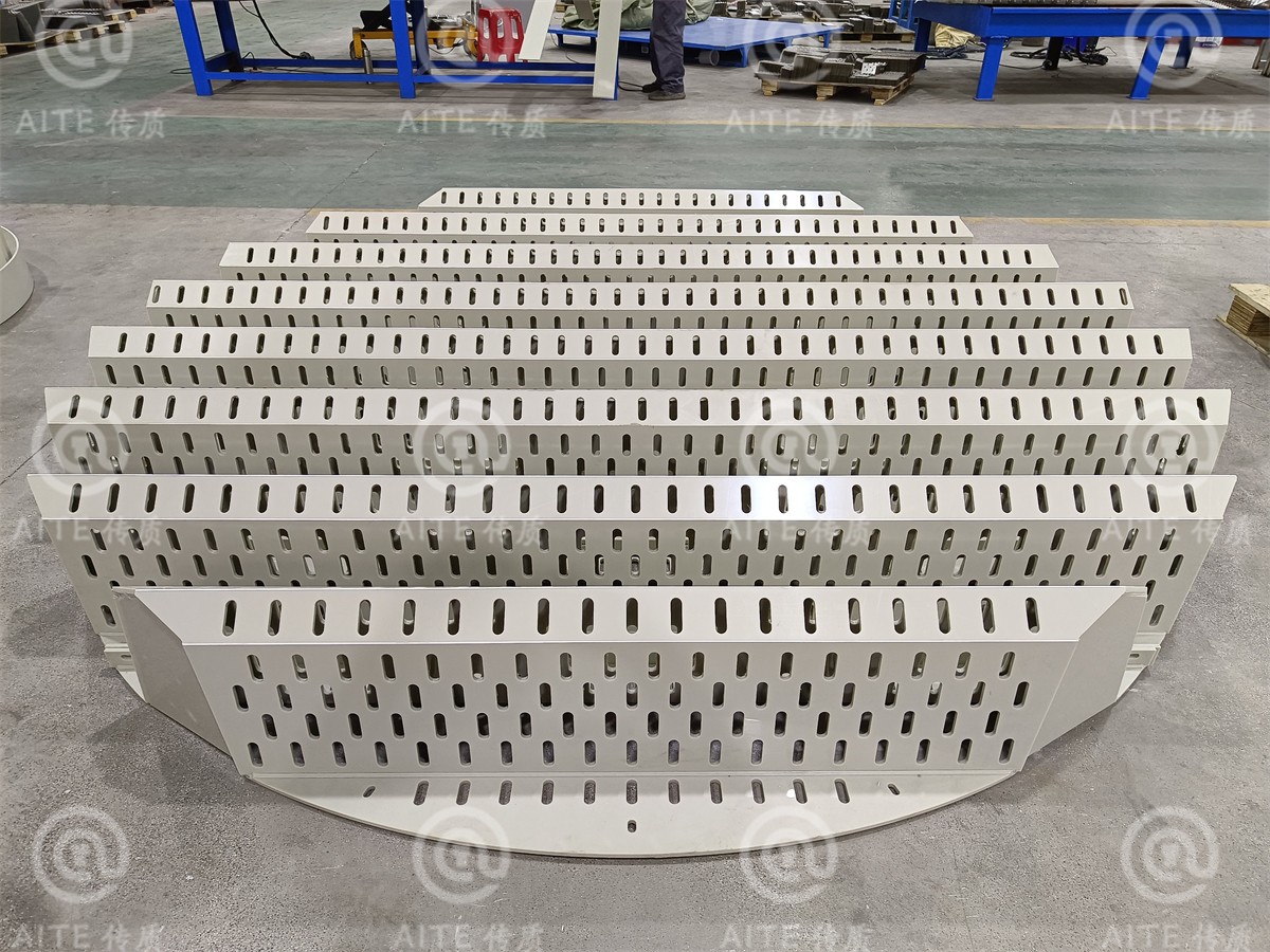 驼峰支撑是目前用于颗粒填料的性能优,应用广的大塔支撑,厂广泛用于炼油、化工、化肥、乙烯和制氧等领域,已应用的大直径10米以上。此外,还有钟罩型支撑,波纹板网支撑和格栅式支撑等。驼峰支承板又称驼峰式填料支撑板,也叫梁型气体喷射式填料支承板,为单体组合。式结构。它是目前较好的散堆填料支承之一,适用于塔径1.5米以上的大塔,应用较广。能从人孔直接进入塔内。单体在塔内放置由凸台定距,间隙10mm,使液体自由流下。驼峰具有长条形侧孔,用钢板冲压成型, 其液体通量可达200m3/m2h,压降为69Pa,适用于25mm以上的各种散堆填料,因此侧孔宽度以25mm填料不致法届出为度,对于更小的填料,可在驼峰上覆盖一层小尺寸的钢板双,其材质可以是各种金属、塑料和陶瓷。场塔径超过3米的大塔,中间要加工字梁与焊在塔壁上的支座固定。支承板由多块梁型支承板拼装而成,为可拆维结构。